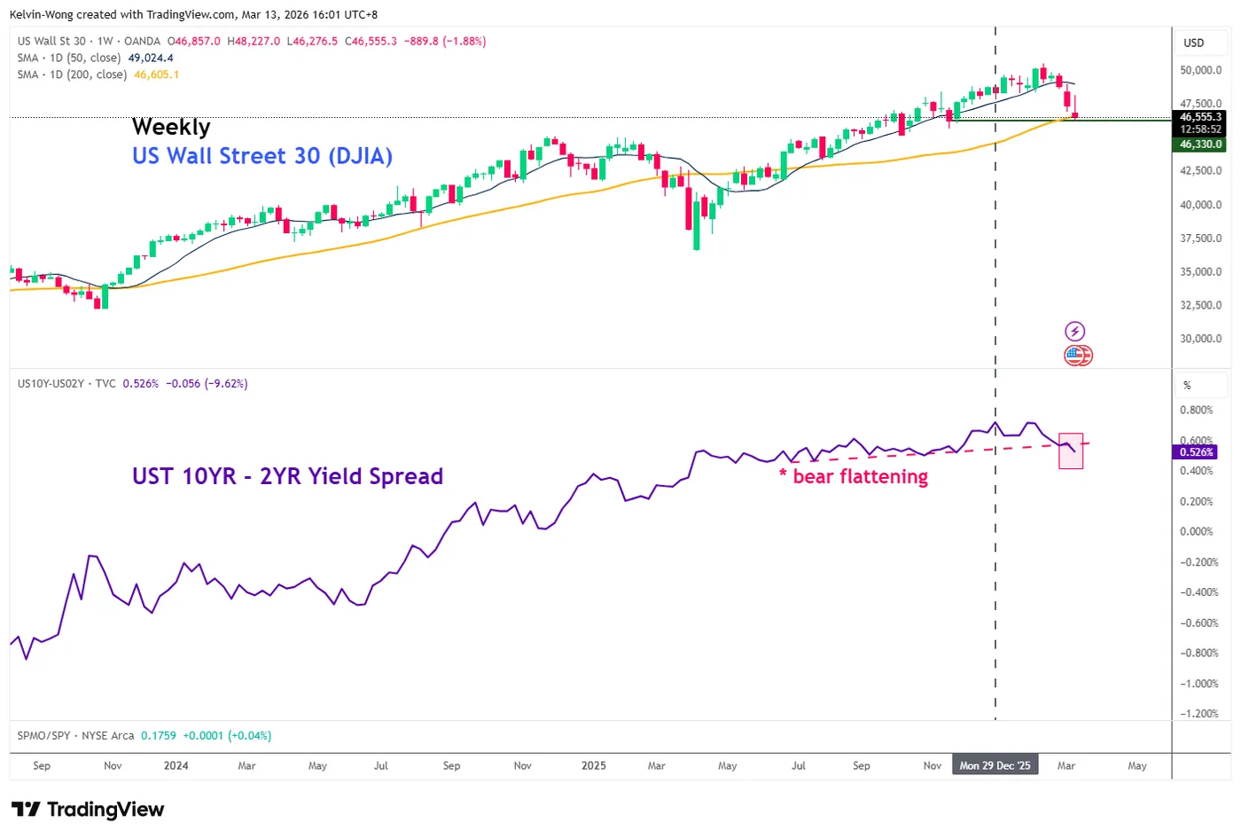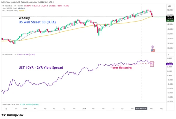 Fig. 3: DJIA & US Treasury yield curve (10-YR minus 2-YR) major trends as of 13 Mar 2026 (Source: TradingView)