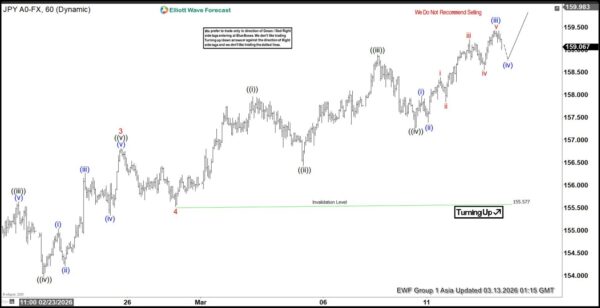 The short-term Elliott Wave outlook for USDJPY indicates that the cycle from the January 28, 2026 low remains in progress, unfolding as an impulsive structure. From that low, wave (1) concluded at 157.72, followed by a corrective pullback in wave (2), which ended at 152.25. The market then advanced into wave (3), developing as an impulse of lesser degree. Within this sequence, wave 3 of (3) terminated at 156.82, as reflected in the one-hour chart. Subsequently, wave 4 of (3) completed at 155.57, setting the stage for the current advance in wave 5.