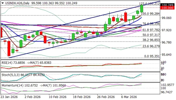 Friday’s rally (index was up nearly 0.7% until mid-US session) broke through key barriers in $100 zone (former top at $99.64 / psychological), as well as the upper boundary of bull-channel from $95.35 ($100.23) and cracked 2025 peak at $100.32, after bulls penetrated falling and thick weekly Ichimoku cloud (base lays at $99.28).