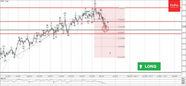 Dow Jones index recently reversed from the support zone between the support level 46500.00 (which stopped the previous impulse wave 1 at the start of March, as can be seen from the daily Dow Jones chart below), 50% Fibonacci correction of the upward impulse from 2025 and the lower daily Bollinger Band.