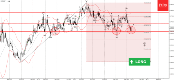 EURGBP currency pair recently reversed from the support zone between the support level 0.8620 (which has been reversing the price from last August), lower daily Bollinger Band and the 50% Fibonacci correction of the upward impulse from last May.