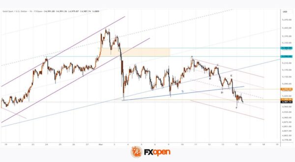 As indicated by the arrow, the XAU/USD chart showed a continuation of the bullish impulse later that same day. However, the move lost momentum around $5235, forming peak A, after which a sequence of lower highs and lower lows (A–B–C–D–E) developed.