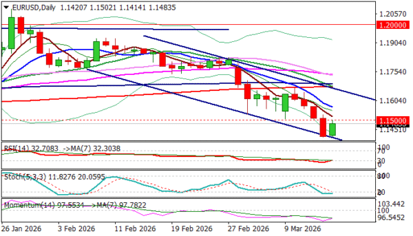 Broken 1.1500 barrier so far limits bounce with stronger upticks to face barriers at 1.1575 (former low of Jan 19 / falling 10DMA) which should ideally cap and offer better opportunities to re-enter bearish market for acceleration towards 1.1354 (Fibo 38.2% of 1.0177/1.2082.