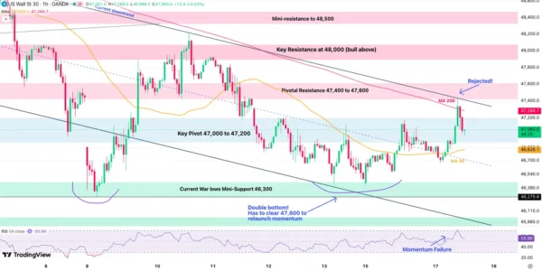 The Dow Jones rejected the upper bound of its descending channel, opening the way for a more mixed price action ahead – 47,000 is the level to watch for the FOMC (Bullish if close above, bearish if close below).