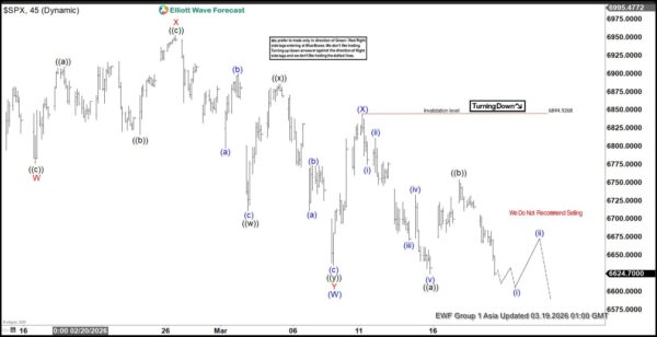 The S&P 500 (SPX) continues to correct the cycle that began from the April 7, 2025 low. The internal subdivision of this correction is unfolding as a double three Elliott Wave structure, which reflects a complex corrective pattern rather than a simple decline. From the January 28, 2026 peak, wave (W) concluded at 6636.04, as illustrated in the 45‑minute chart. Within wave (W), the internal subdivision itself developed as another double three of lesser degree. In this sequence, wave W ended at 6775.5, wave X at 6952.51, and wave Y at 6636.04. This completed wave (W) at the higher degree.