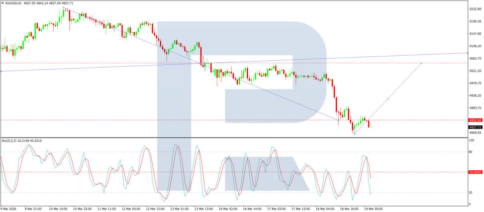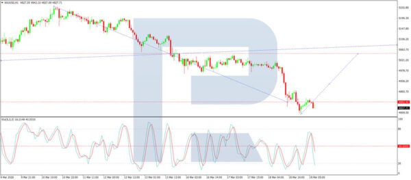 On the H1 chart, the market broke below the 5,035 USD level and completed a wave down to 4,852 USD. Looking ahead, a corrective growth wave towards 5,044 USD is possible, followed by further downside to 4,761 USD. The Stochastic oscillator supports this scenario, with its signal line remaining above 50 and showing potential to rise towards 80 before turning lower.
