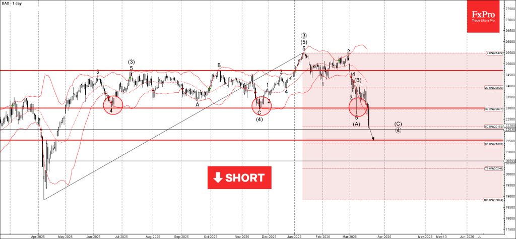 DAX index recently broke the support zone between the powerful long-term support level 23000.00 (which has been reversing the price from June of 2025) and 38.2% Fibonacci correction of the upward impulse from April.