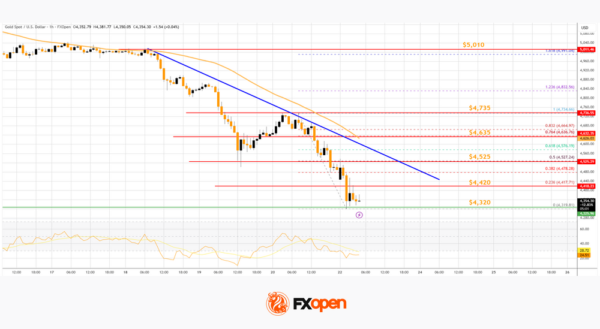 There was a sharp drop below $4,500. The price settled below the 50-hour simple moving average, and RSI dipped below 30. Finally, it tested the $4,320 zone. A low was formed at $4,319, and the price is now consolidating losses.