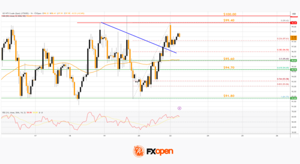 On the hourly chart of WTI Crude Oil at FXOpen, the price started a strong increase from $91.80 against the US Dollar. The price gained bullish momentum after it broke $95.00.