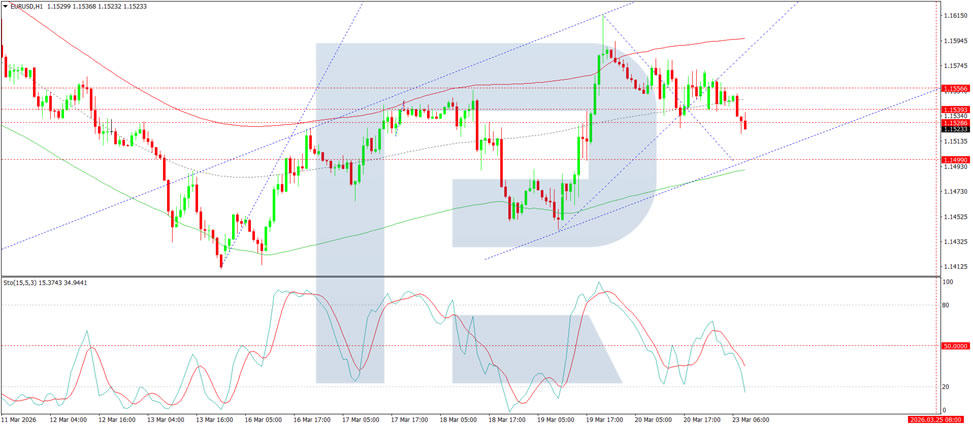 On the H1 chart, the market is forming the structure of the next downward wave towards 1.1499. After reaching this level, a rebound to 1.1556 is expected, with potential for the subsequent growth wave to extend to 1.1647. Technically, this scenario is confirmed by the Stochastic oscillator – its signal line is below 50 and pointing firmly downwards towards 20.