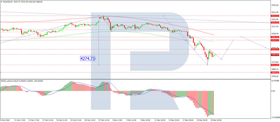 On the H4 XAU/USD chart, the market is forming a consolidation range around the 4,383 USD level. An upside breakout would open the path for a correction towards 4,850 USD, while a downside breakout could see the downward wave extend to 4,272 USD. The MACD indicator confirms the current momentum, with its signal line below the centre line but pointing sharply upwards.