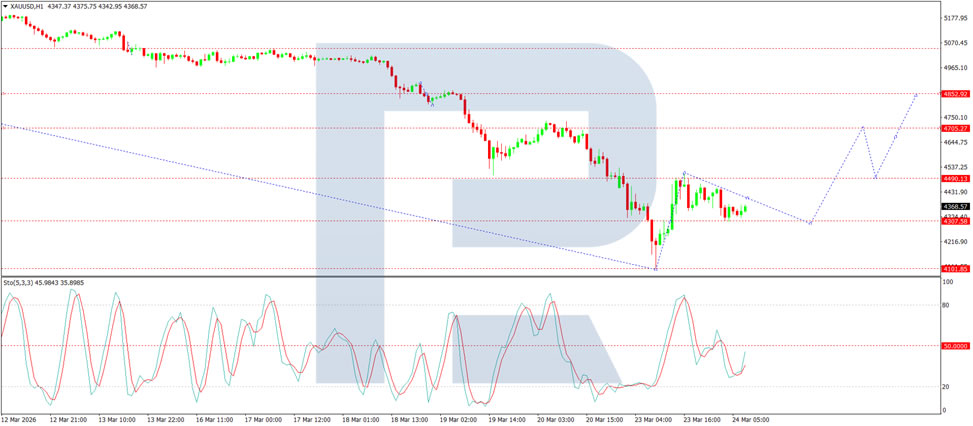 On the H1 chart, the market broke above the 4,300 USD level and completed a wave to 4,414 USD. Looking ahead, a corrective move back to 4,308 USD is likely, followed by an anticipated rise to 4,505 USD. The Stochastic oscillator supports this scenario, with its signal line remaining above the 20 level and showing potential to rise towards 80.