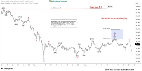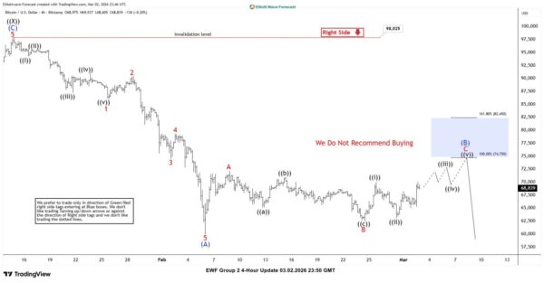 Here’s 4-hour Elliott wave Chart from the 3.02.2026 update. In which, the decline to $59930 low ended 5 waves from the 1.14.2026 high within wave (A) & made a wave (B) bounce. The internals of that bounce unfolded as an Elliott wave zigzag correction where wave A ended at $72174 high. Then a decline to $62525 ended wave B pullback and started the C leg higher towards $74750- $82450 blue box area from where sellers were expected to appear looking for more downside or for a 3 wave reaction lower at least.