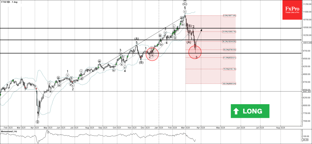 Given the strong daily uptrend, FTSE 100 index can be expected to rise toward the next resistance level 10100.00 (former low of wave (A)).