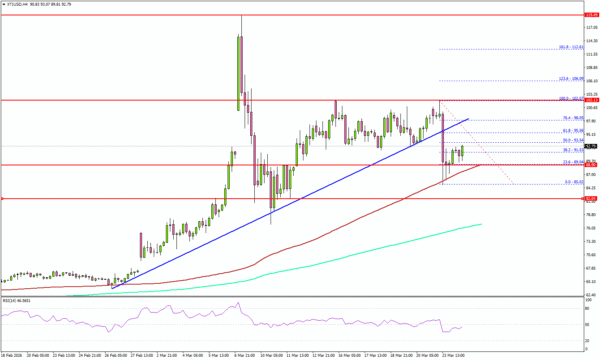 Looking at the 4-hour chart of XTI/USD, the price traded below a bullish trend line at $96.00. However, the bulls were active above $85.00 and the 100 simple moving average (red, 4-hour). As a result, the price started a consolidation phase above $85.00.