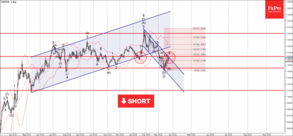 EURUSD currency pair recently reversed from the resistance area between the resistance level 1.1635 (former support from January), resistance trendline of the daily down channel from January and 38.2% Fibonacci correction of the downward impulse from January.