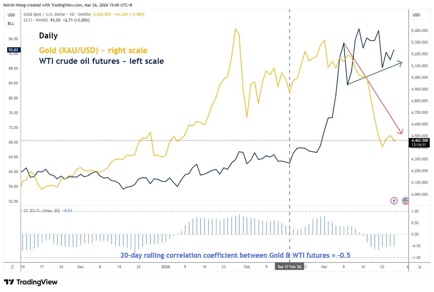 Fig. 1: Gold (XAU/USD) & WTI crude oil futures indirect correlation as of 26 Mar 2026 (Source: TradingView)