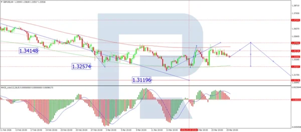 On the H4 GBP/USD chart, the market is forming a broad consolidation range around 1.3354, currently extending up to 1.3434. A decline to 1.3255 is expected in the near term, followed by the formation of a new consolidation range. An upside breakout would pave the way for a continuation wave to 1.3494, while a downside breakout would suggest further movement to 1.3119. Technically, this scenario is confirmed by the MACD indicator, whose signal line is above zero and pointing firmly downwards.