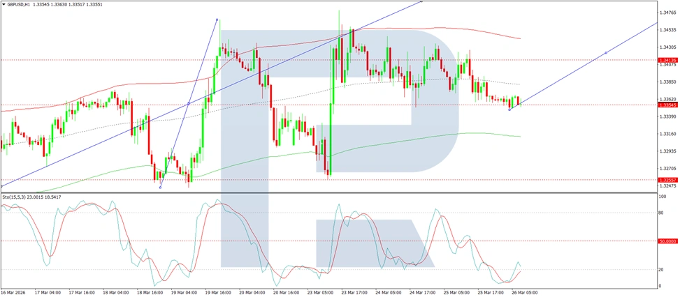 On the H1 chart, the market has formed a compact consolidation range around 1.3355. A downside breakout has initiated a wave structure extending to 1.3255. Should this level be breached, further downside towards 1.3125 is likely. Conversely, an upside breakout from the range could trigger a growth wave to 1.3494. Technically, this scenario is confirmed by the Stochastic oscillator, with its signal line below 20 and pointing firmly downwards.
