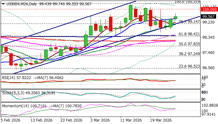 Fading ceasefire hopes after initial euphoria that pushed the dollar index down over 10% on Monday, revived bulls and kept the index within broader bull-channel after pullback from new 2026 high at $100.26 (on failure to hold gains above $100 breakpoint) was repeatedly contained by rising channel support line.