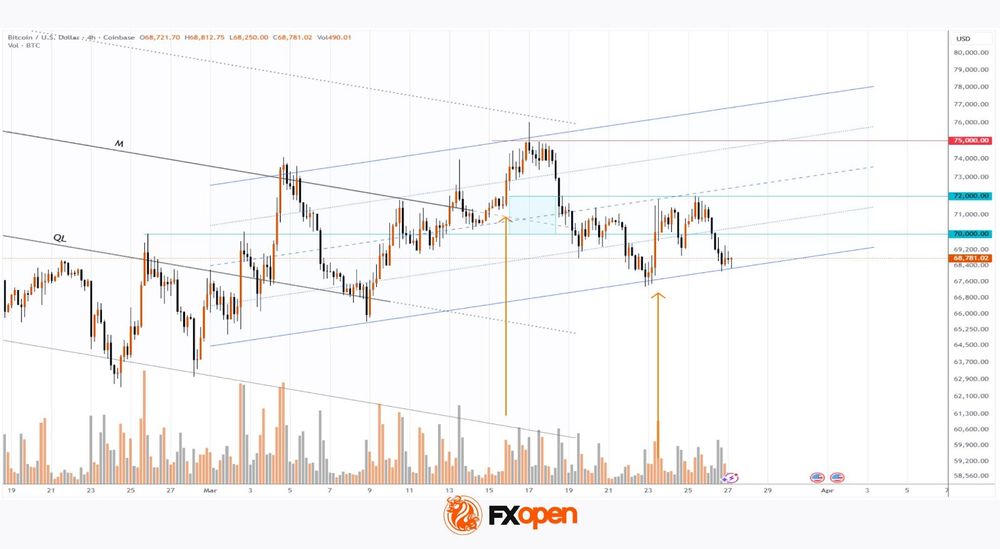 Today, BTC/USD is trading slightly below the psychological $70k level. Assessing its price action since the panic on 5 February, it is reasonable to suggest that the market is showing signs of range-bound behaviour: sellers tend to emerge near $75k, while buyers become active around $65k.