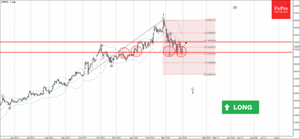 Nikkei 225 recently reversed from the support zone between the pivotal support level 51235.00 (which has been reversing the price from January), lower daily Bollinger Band and the 61.8% Fibonacci correction of the upward impulse from October.