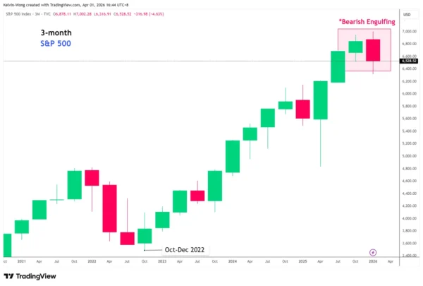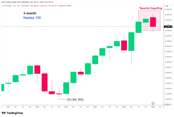 The 3-month charts of the cash stock indices have formed bearish reversal candlestick patterns at the end of Q1 2026.