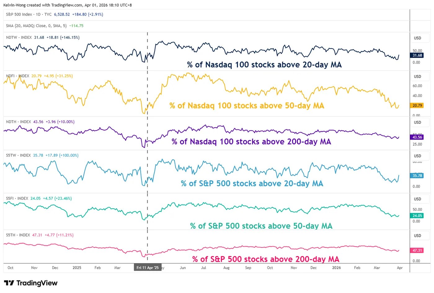Fig. 4: Percentages of S&P 500 & Nasdaq 100 stocks above 20-day, 50-day & 200-day MAs as of 31 Mar 2026 (Source: TradingView)