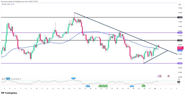 Bitcoin (BTC/USD) has kickstarted the new quarter with a renewed sense of optimism, snapping a grueling five-month losing streak, its longest since 2018. After a bearish start to the week, the premier cryptocurrency has caught a bid in early Wednesday trade, reclaiming the $68,500 handle and teasing a breakout toward psychological resistance at $70,000.