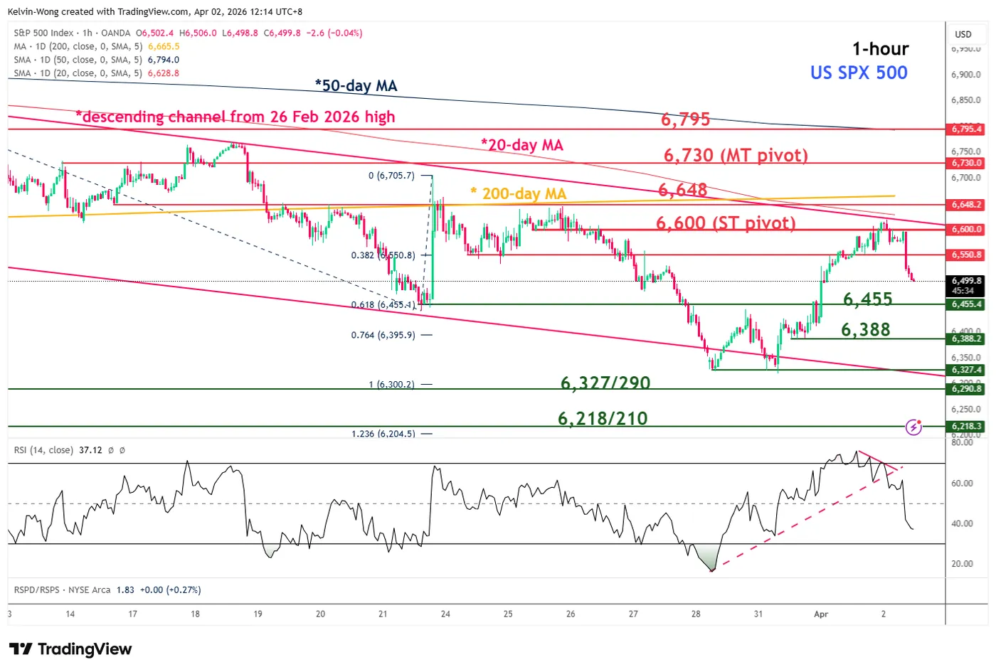 The price actions of the US S&P 500 CFD index (a proxy of the S&P 500 E-mini futures) have staged a bearish reaction right after a retest on its 20-day moving average and upper boundary of a descending channel in place since 26 February 2026 high (see Fig. 1).