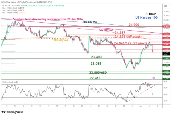 Watch the 24,047/24,177 key short-term pivotal resistance, and a break below 23,400 near-term support is likely to trigger another potential bearish impulsive down move sequence to expose the next intermediate supports at 23,085 and 22,800/22,680.