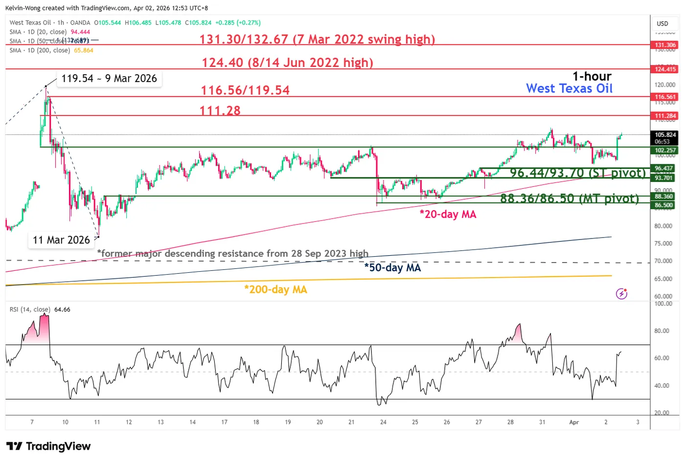 The intraday sell-off seen on Wednesday, 1 April 2026, for West Texas oil CFD (a proxy of the WTI crude oil futures) has been erased as its price actions trade back above $102.25 (see Fig. 5).