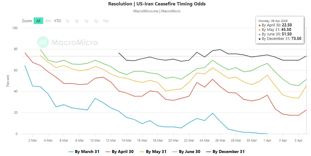 Fig. 1: Polymarket US-Iran ceasefire timing odds as of 6 Apr 2026 (Source: MacroMicro).