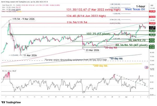 In today’s early Asian session (Monday, 6 April 2026), the price actions of the West Texas oil CFD gapped up by 2.9% to print a current intraday high of $116.17, just shy of its 4-year high of $119.54 recorded on 9 March 2026, as the market digested the possibilities of further hostilities between US and Iran where Trump posted a social media with foul language, warning Iran’s power infrastructure will be destroyed if Tehran does not open the Strait of Hormuz by Tuesday, 7 April 2026 8.00 p.m. Eastern Time (an extension of an earlier Monday deadline).
