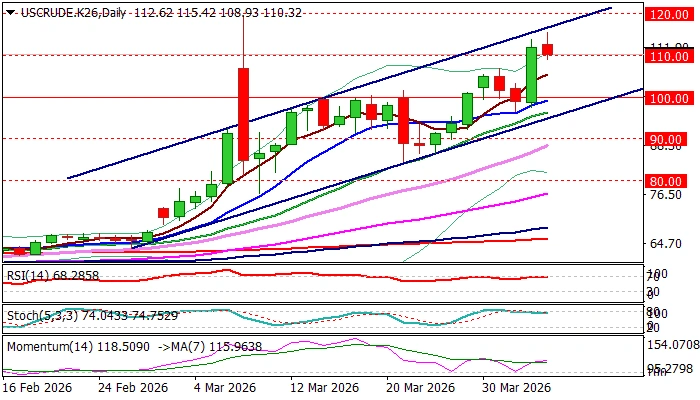 Consolidation with limited dips (to be ideally contained at $105/$104 zone) is needed to keep broader bulls intact and mark a healthy correction of the latest upleg ($84.49/$115.42) ahead of fresh push higher.