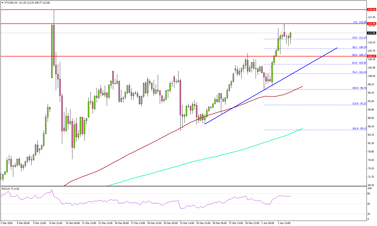 Looking at the 4-hour chart of XTI/USD, the price settled well above the 100 simple moving average (red, 4-hour) and the 200 simple moving average (green, 4-hour). On the upside, immediate resistance is near the $115.50 level.