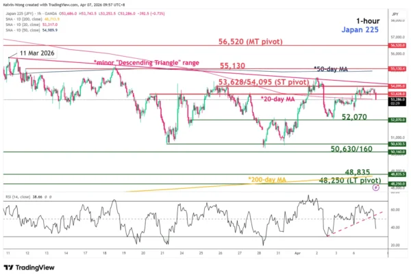 Watch the 53,628/54,095 short-term pivotal resistance zone for potential bearish reversal back down to retest the “Descending Triangle” range bottom. A break below 52,070 increases the odds of exposing the next intermediate support at 50,630/50,160 in the first step.