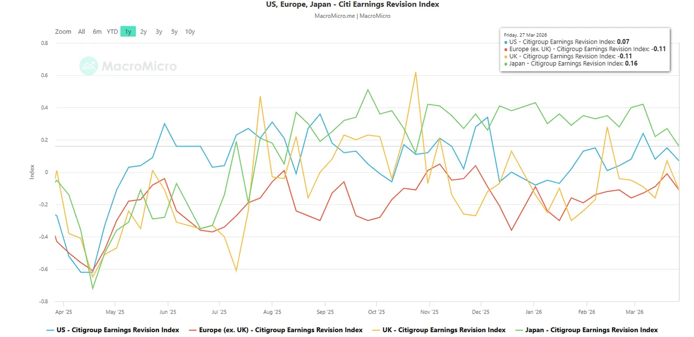 Fig. 2: Citigroup Earnings Revision Index for Japan, US & Europe as of 27 Mar 2026 (Source: MacroMicro).