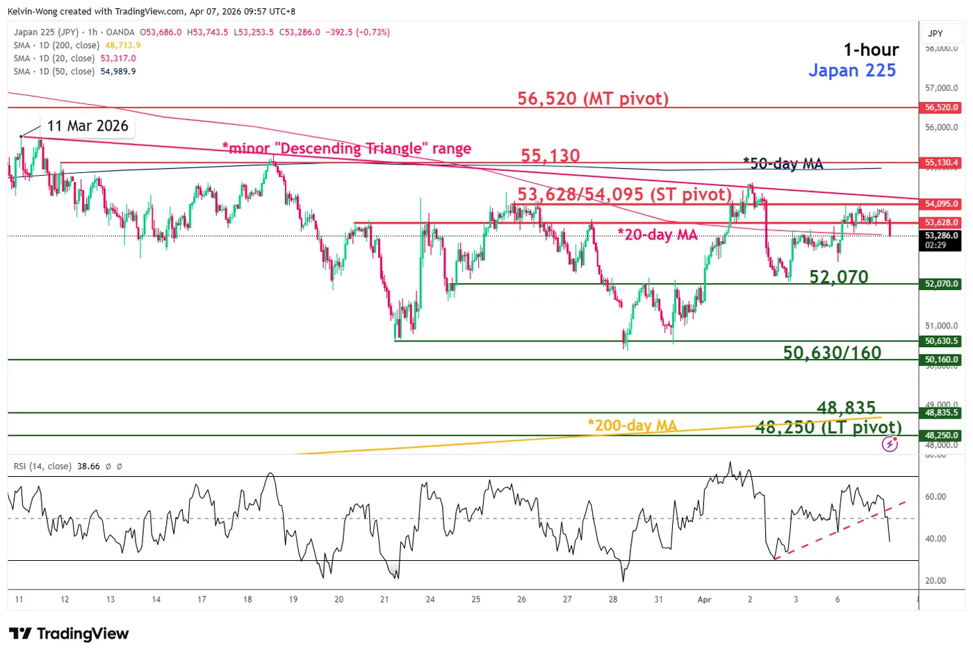 Nikkei 225 – Oscillating within a minor “Descending Triangle” range
