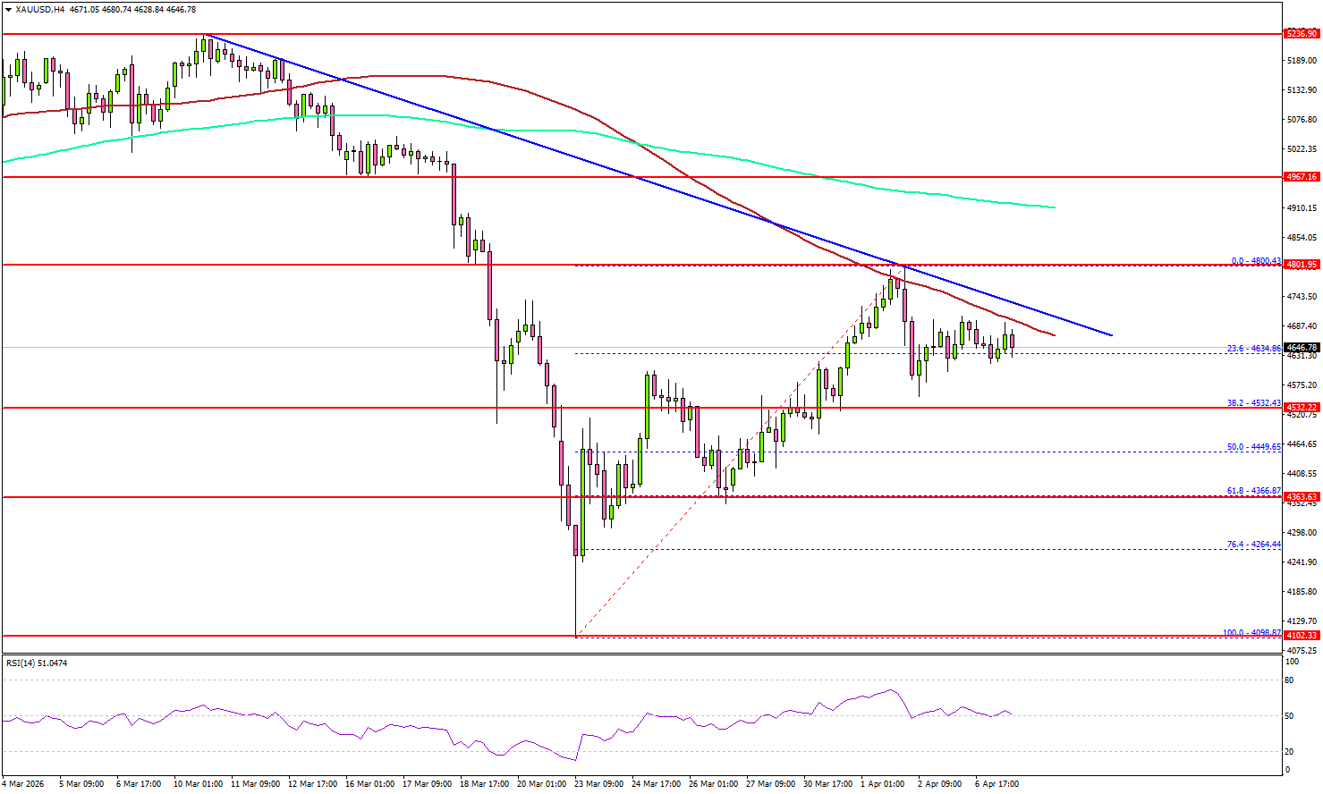 The 4-hour chart of XAU/USD indicates that the price even surpassed the $4,500 resistance zone. Finally, the bears appeared near the $4,800 zone and the 100 Simple Moving Average (red, 4 hours). There is also a major bearish trend line forming with resistance at $4,735.