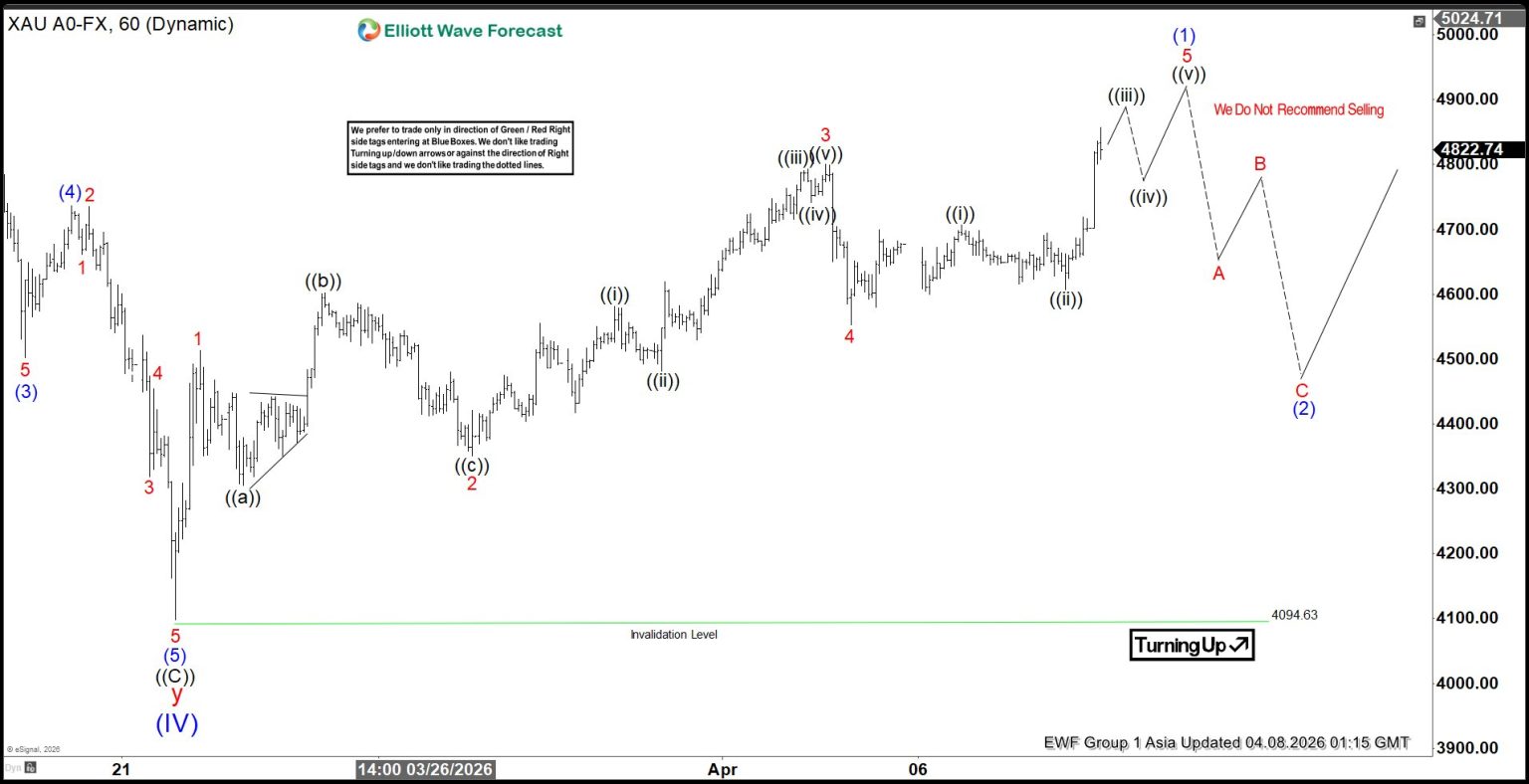 The short-term rally from the wave (IV) low has already displayed a five-swing structure. This pattern is characteristic of a motive sequence, which generally signals continuation rather than exhaustion. Consequently, the technical picture favors further upside momentum. From the wave (IV) base, wave 1 concluded at $4512.85, followed by wave 2 at $4350.52. Wave 3 extended higher to $4800.46, while the subsequent pullback in wave 4 ended at $4553.16. Current price action suggests that wave 5 is nearing completion. Once finalized, this will mark the end of wave (1) at a higher degree.