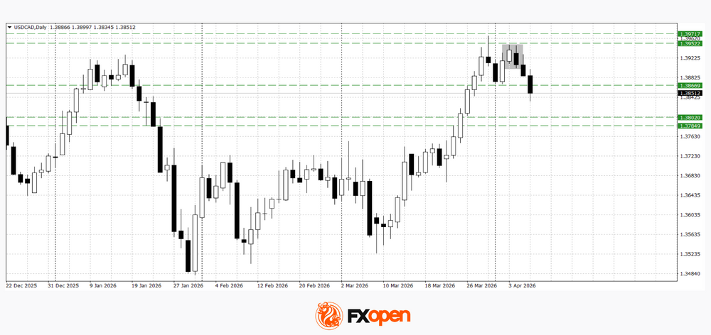 USD/CAD has formed a “dark cloud cover” pattern after a repeated test of the 1.3950 level. If the pair consolidates below 1.3880, the decline may extend towards 1.3780–1.3800. A break above 1.3970 would invalidate the bearish scenario.