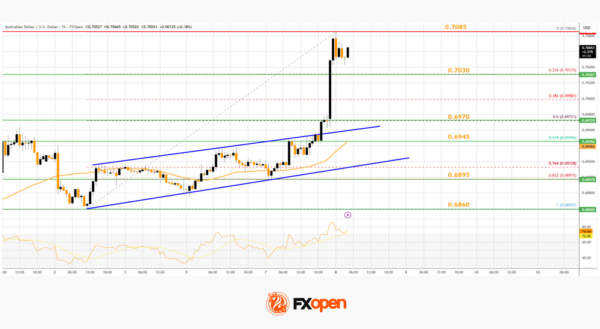 • There was a break above a rising channel with resistance at 0.6960 on the hourly chart of AUD/USD at FXOpen.