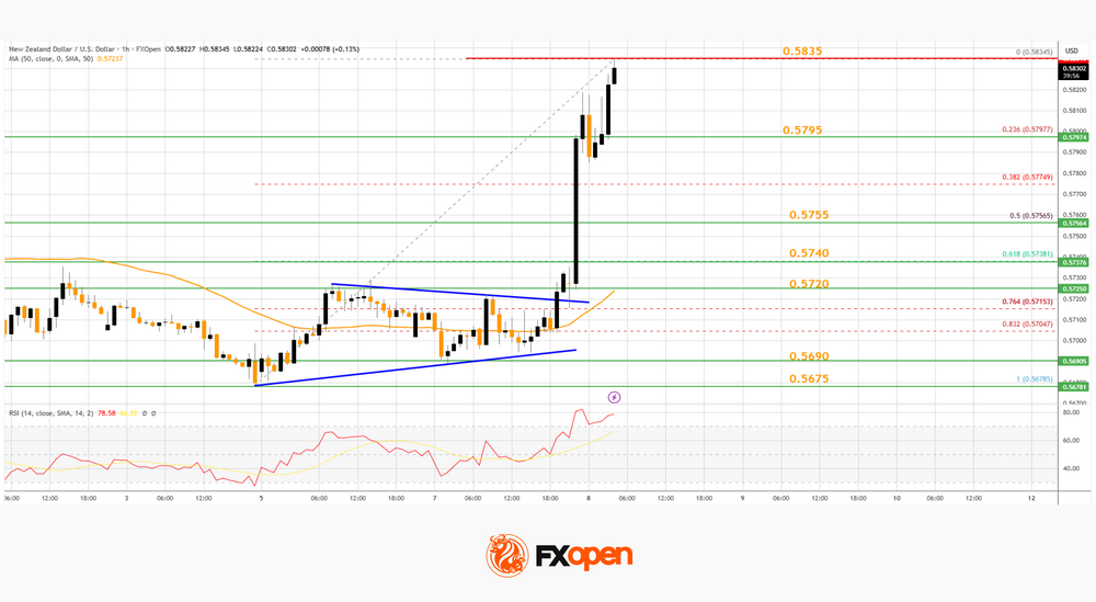 •  There was a break above a key contracting triangle with resistance at 0.5710 on the hourly chart of NZD/USD at FXOpen.
