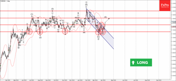 Given the clear daily uptrend, EURUSD currency pair can be expected to rise to the next resistance level 1.1800 (top of wave 2 from February).
