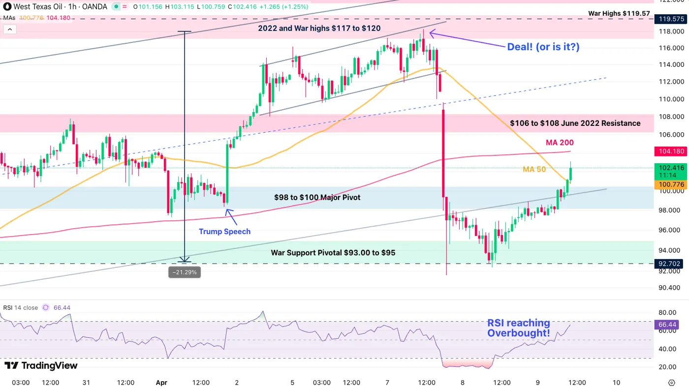 Since the gap lower, prices have been grinding steadily higher again, now hovering back near the key $100 level — a sign that traders are reassessing just how fragile this truce really is.