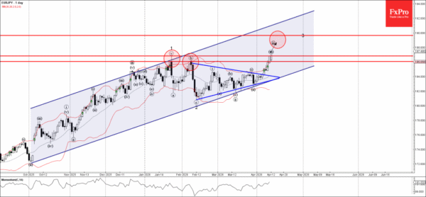 Given the clear daily uptrend, EURJPY currency pair can be expected to rise to the next resistance level 190.00 (target price for the completion of the active impulse wave 3.).