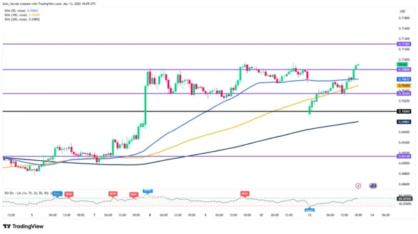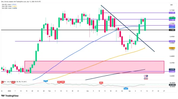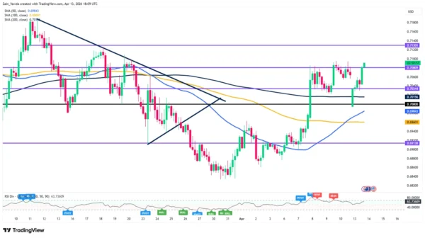 We can see a clear “V-shaped” recovery from the late March lows. The pair has successfully flipped the 0.7000 level from resistance to support. Currently, the RSI (Relative Strength Index) is hovering near the 66 level; while this indicates strong bullish momentum, it suggests there is still some “headroom” before the pair reaches overbought territory, allowing for further upside in the short term.