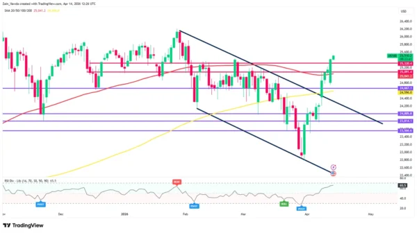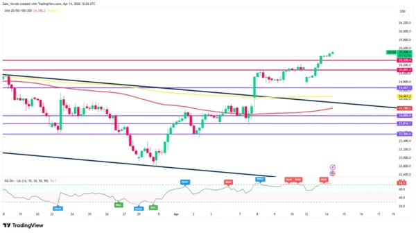 Currently, the index is trading above the 25,320 resistance-turned-support level. The RSI on the daily is approaching overbought territory (65.5), but it still shows room for a final push toward the previous all-time highs near 26,200 before a meaningful correction is required.