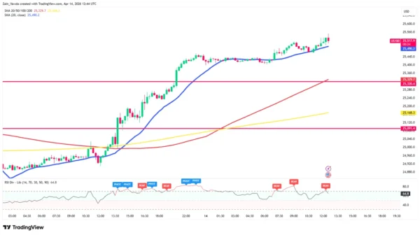 If the US session opens with strong buying pressure, look for a sustained hold above 25,500. A break and close above the most recent intraday high (25,560) would open the door for a move toward 25,750. The bulls will be emboldened as long as the price stays above the 20-period MA (Blue line) on this timeframe.